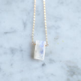 Our Theia necklace is inspired by the greek goddess, Theia. We feel that all women are goddesses and deserves to feel magical. This stunning rainbow moonstone, with a unique baguette cut, will give you all the goddess feels.