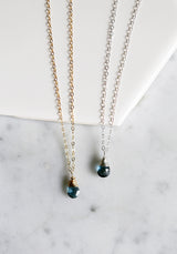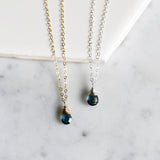 A beautiful London Blue Topaz stone hung on a dainty gold or silver chain. We are so excited to offer this rare and lovely addition to our collection.