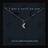 The Moon Child Necklace features a 14k Gold plated moon pendant with white enamel and a single CZ diamond detail. The perfect dainty moon necklace. Great for layering.